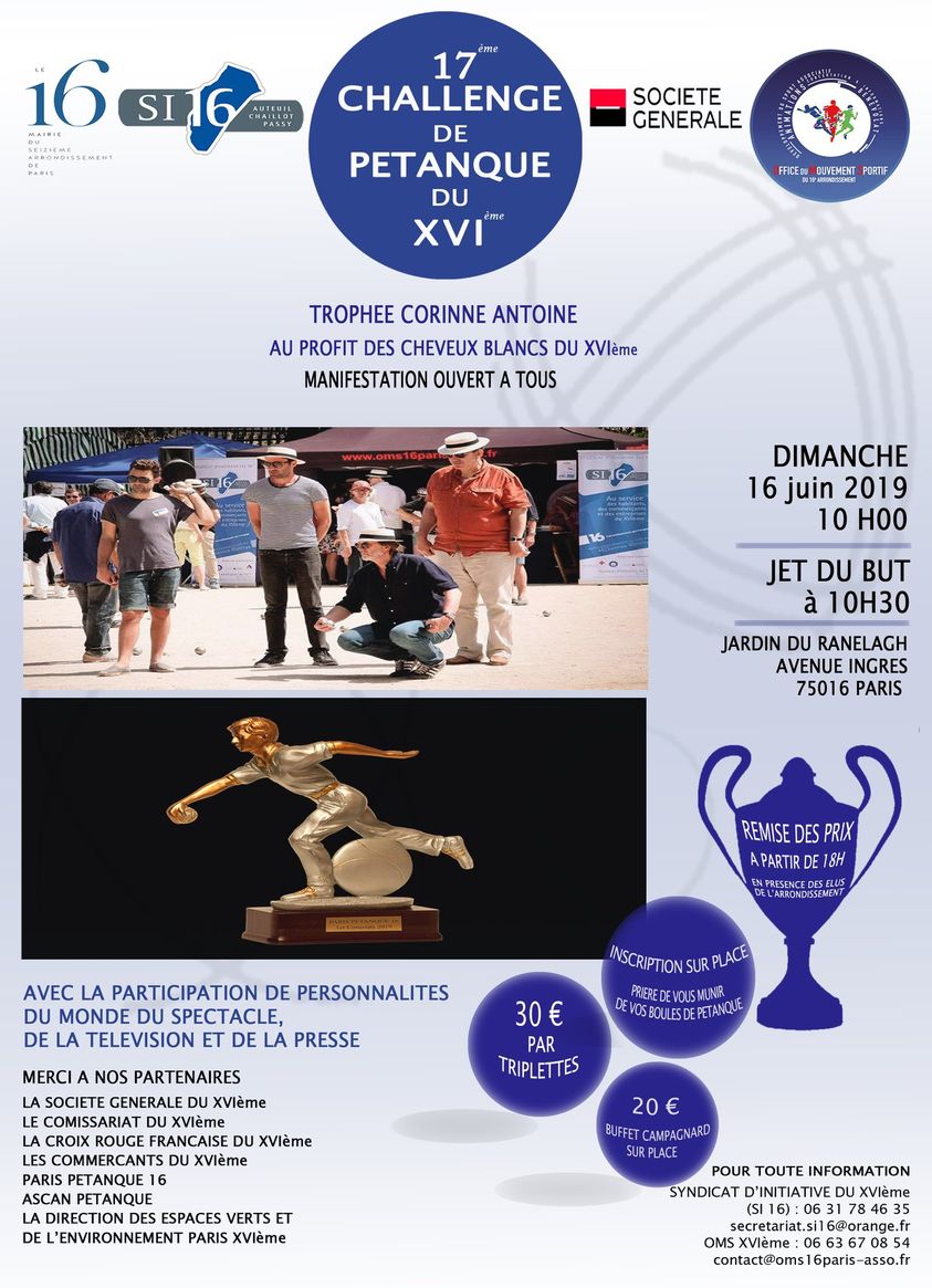 Une belle ambiance et de belles rencontres à l’occasion de la 17ème édition du Challenge de Pétanque du 16eme organisé le 16 juin 2019 dans les jardins du Ranelagh, à Paris, par le Syndicat d’Initiative du 16ème, l’Office du Mouvement Sportif du 16ème et leurs partenaires, sous l’égide de la Mairie du XVIème.