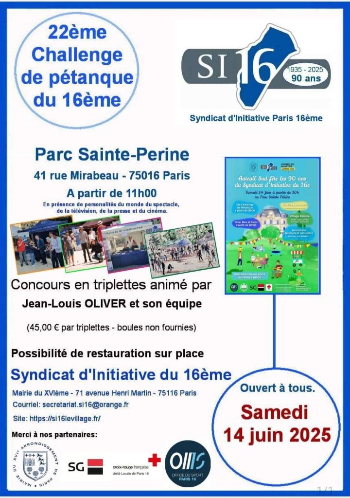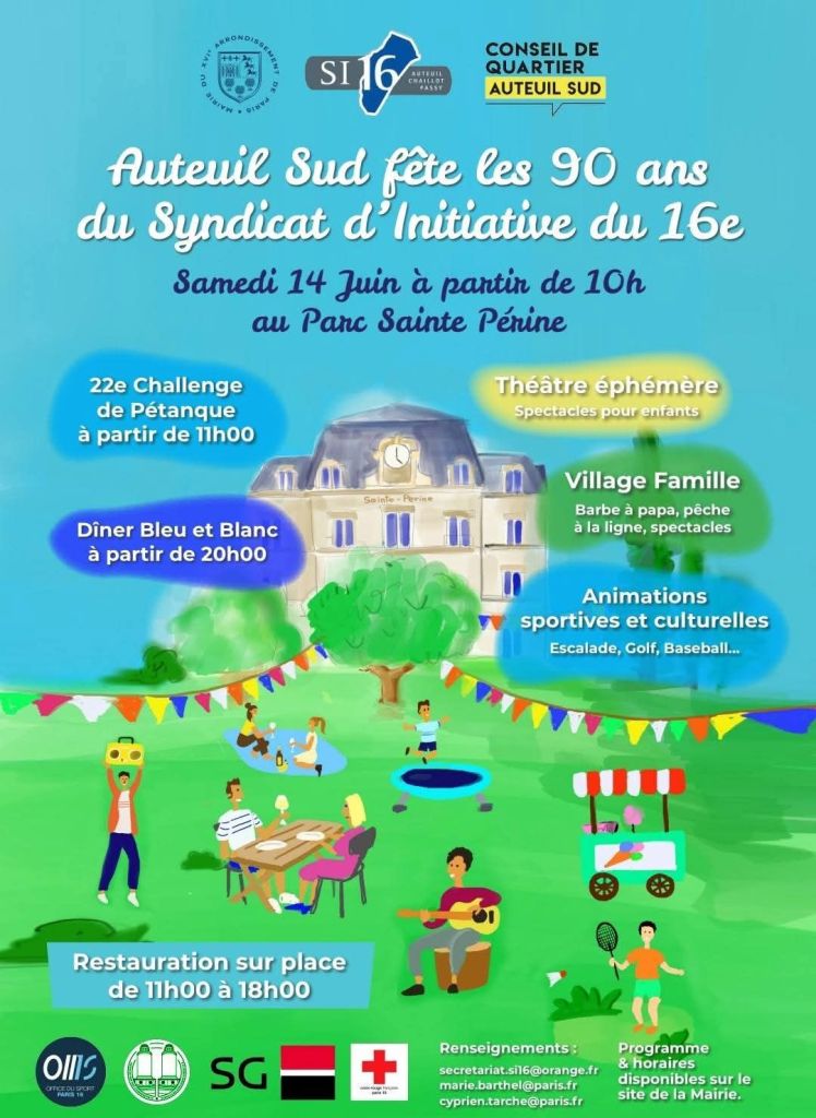 Parmi les événements à venir, la célébration des 90 ans du Syndicat d’initiative lors d’une grande journée anniversaire prévue le 14 juin prochain au parc Sainte-Perine (75016).