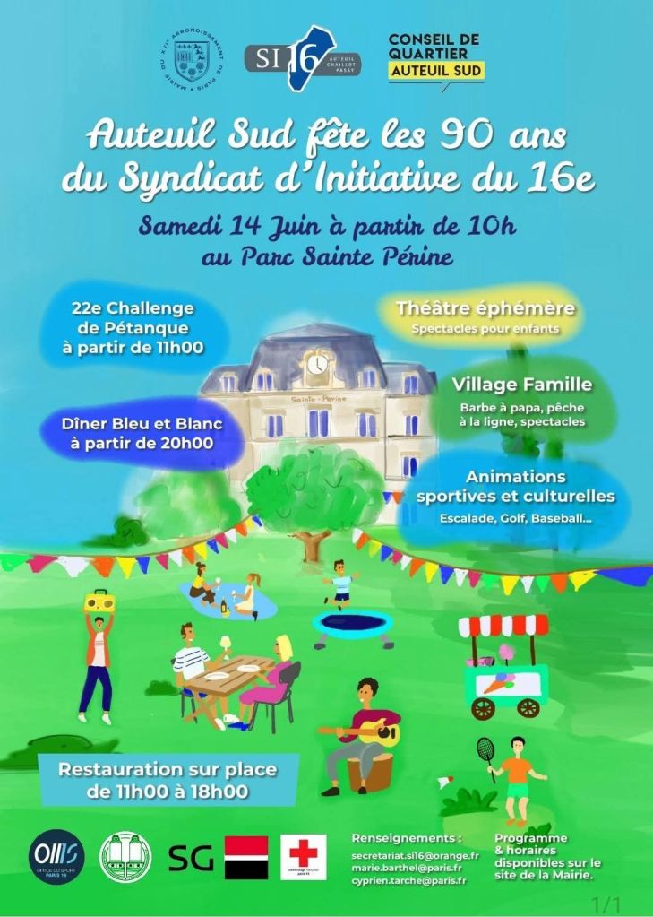 Associé à la Mairie du 16 , le Conseil de Quartier Auteuil sud et l’Office du Sport du 16ème (OMS16), le Syndicat d’Initiative du 16ème vous donne rendez-vous le samedi 14 juin prochain au parc Sainte-Perine, pour célébrer son 90ème anniversaire.